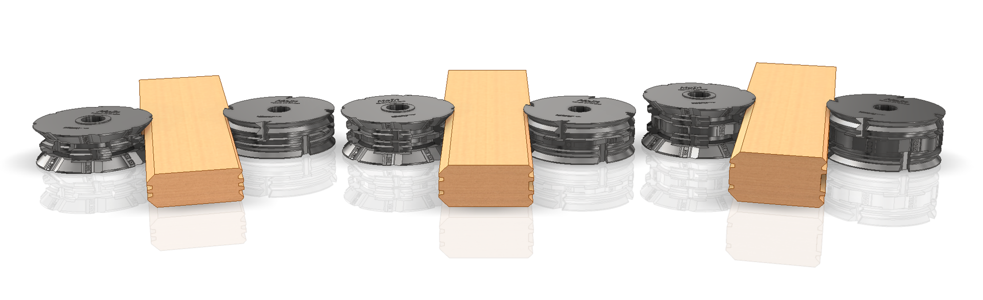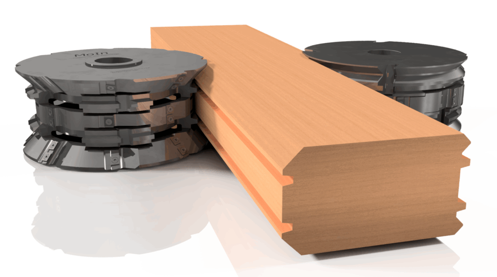 Ein Ensemble aus verschieden starken, rustikalen Blockhausprofilbohlen (t = 80mm, 100mm, 120mm) wird mit einem modularen Werkzeugsystem durch Tausch des in der Mitte liegenden Fügefräsers bedient.