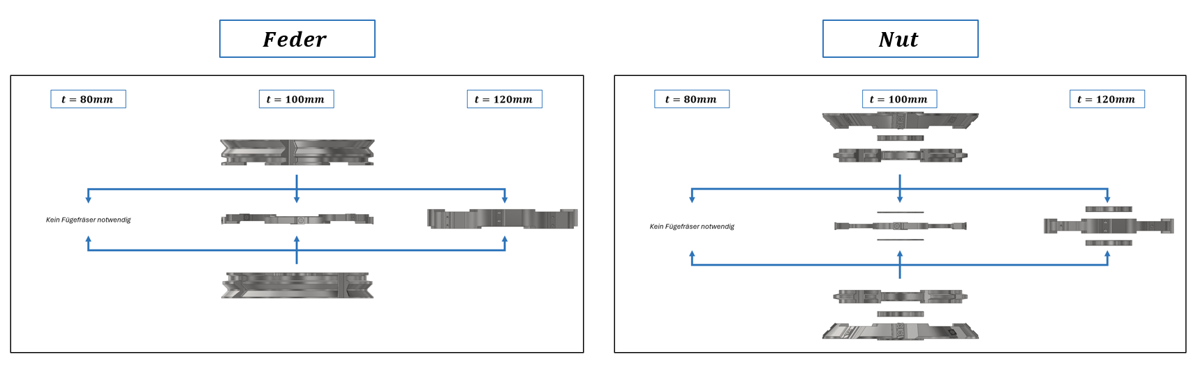 Je nach Zusammenbau der Werkzeuge können die verschiedenen Stärken bearbeitet werden: